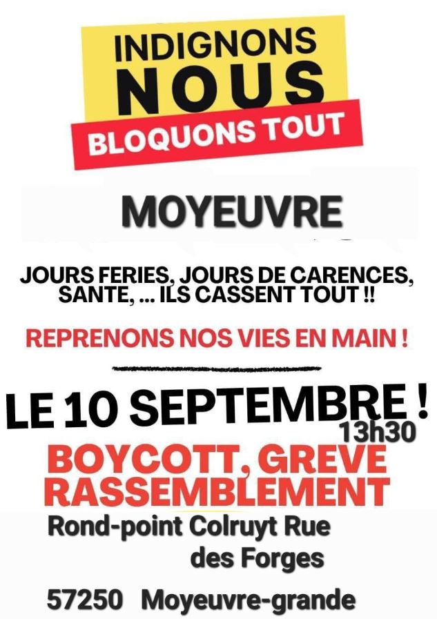 Accueil > Groupe géolocalisés > France > GRAND EST > 57 - Moselle > Rassemblement 10/09 13h30 Rond-point Colruyt MOYEUVRE-GRANDE