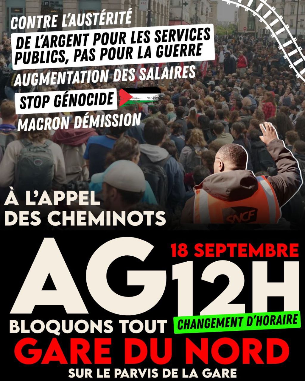 – 12h Assemblée et rassemblement Bloquons Tout, sur le parvis de la Gare du Nord, ouvert à toutes et tous, à l’appel des cheminots. – 13h30 Départ en manifestation.