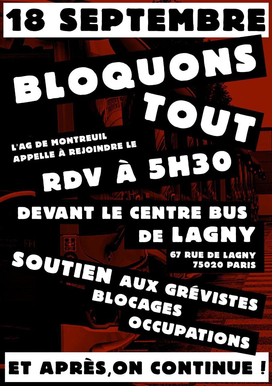 JEUDI 18 SEPTEMBRE, l’AG de Montreuil appelle a rejoindre le piquet de grève de Lagny. 🚌 ⏰ À 5h30 rejoignons-nous pour une journée de blocage et soutien aux grévistes !